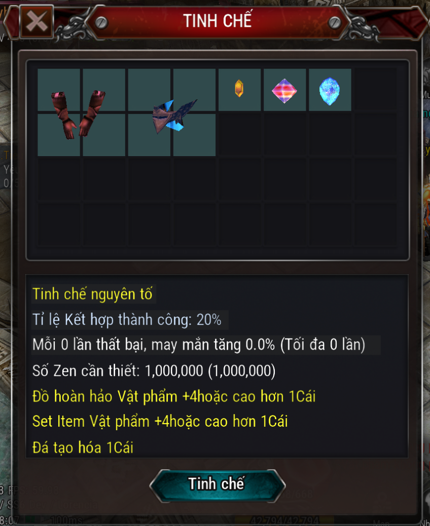 | Vật phẩm | Tất cả vật phẩm đang sử dụng có chứa các ngọc nguyên tố (số lượng) | Option | Tỉ lệ thành công | |||||