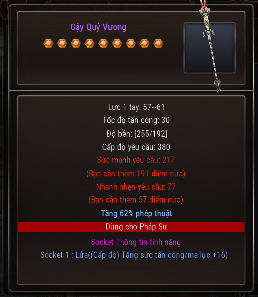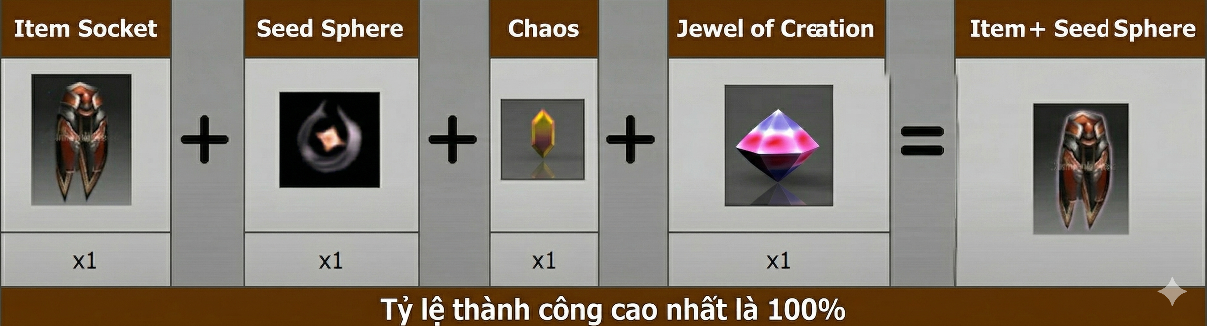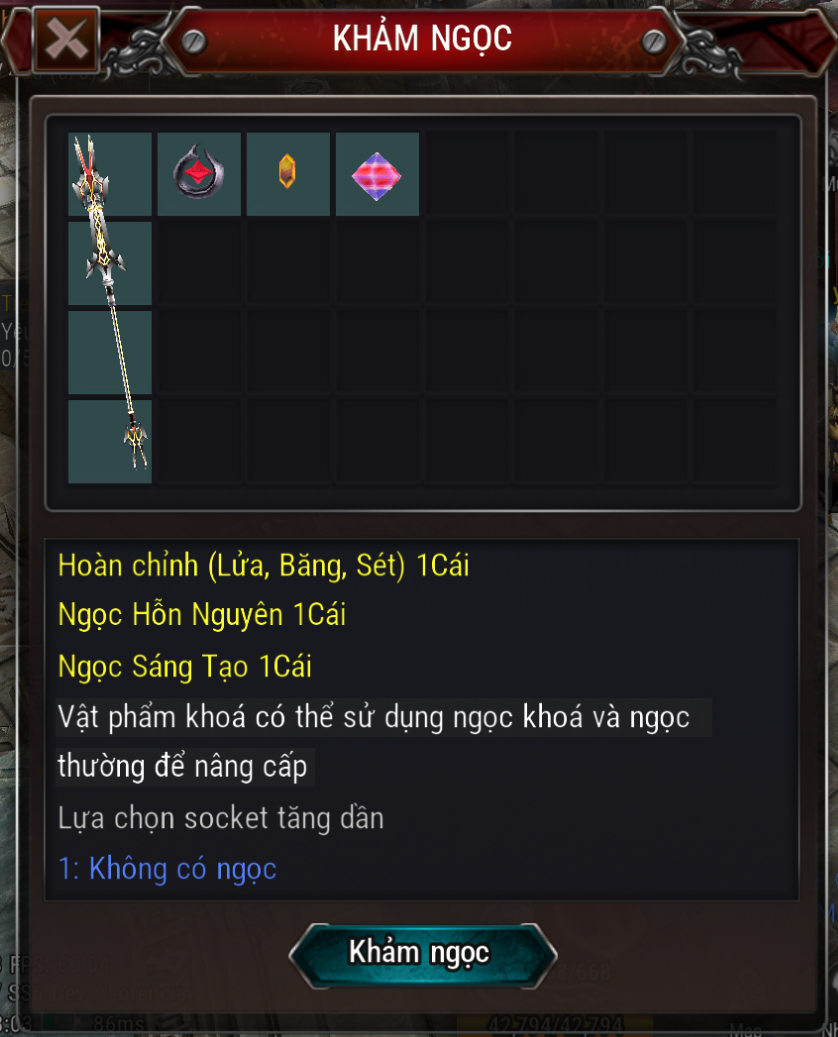 | Vật phẩm có socket | item vũ khí/phòng ngự phải còn dư socket | 1 |