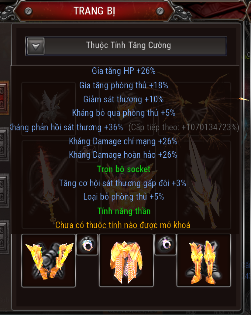 | Kiếm / Chùy / Cung / Quyền Trượng | Nguyên Tố Lửa | Nguyên Tố Sét | Nguyên Tố Băng | Tăng sức sát thương +110 | 30% |