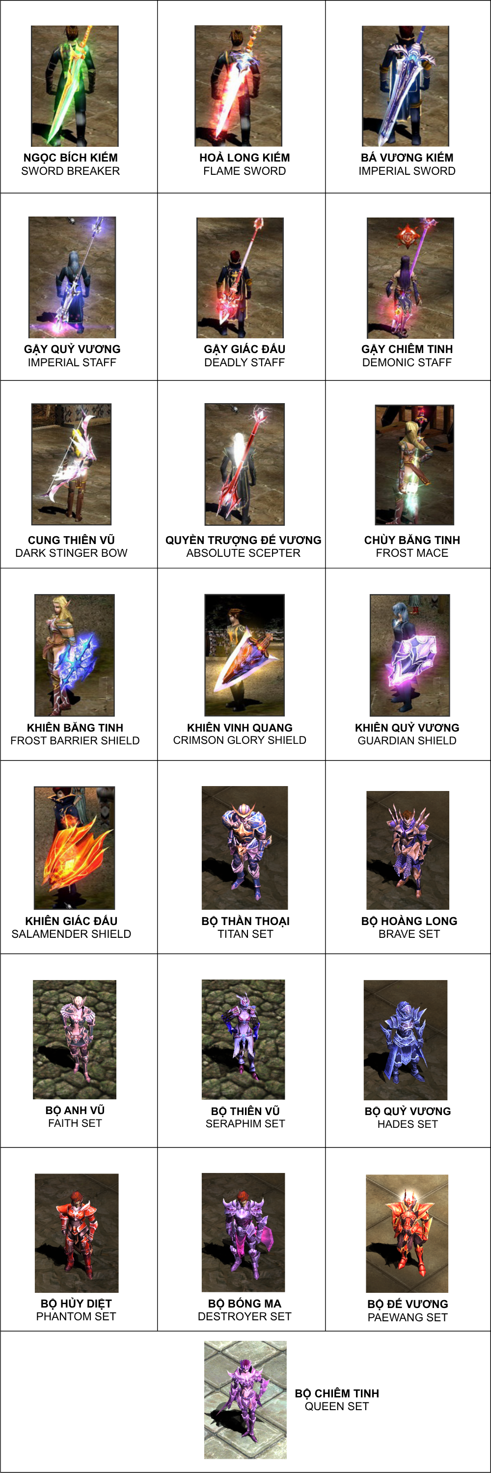 | Kiếm / Chùy / Cung / Quyền Trượng | Nguyên Tố Lửa | Nguyên Tố Sét | Nguyên Tố Băng | Tăng sức sát thương +110 | 30% |